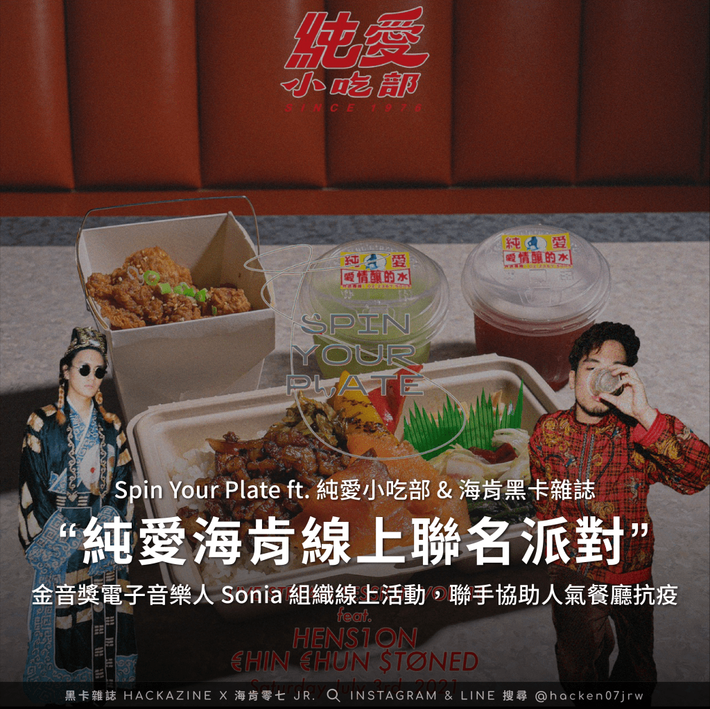 今年疫情復燃導致許多與次文化派對息息相關的人氣餐廳陷入低潮,進而催生由榮獲金音獎肯定之音樂人 Sonia Calico 聯手先前於台北地下場館 FINAL 打造DJ麻將大賽的跨國際資深DJ Hojo 與 法國海肯 多次邀約的 baloneybillionaire,加上 NXWV Media A&R並長期紀錄亞洲跳舞場景之攝影師 ASH 共同組織的線上派對 - Spin Your Plate。