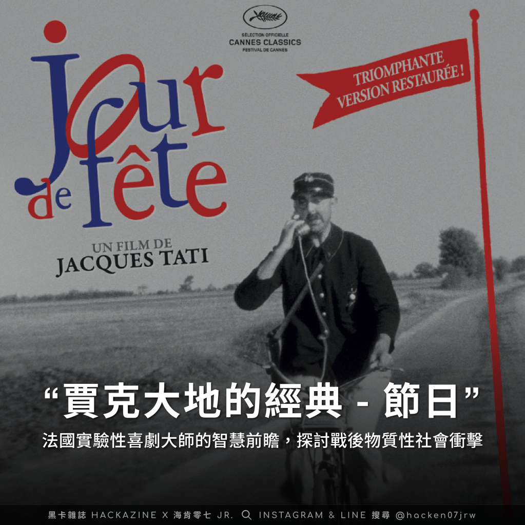 如此取巧的速食體制一旦長時運作,不免令人意識到精神的重要性,試圖重新檢討本質、意義云云。於是昔稱陶冶性情的文藝領域首當其衝,耗資費時的修復電影如雨後春筍湧現,更在近年搬上各大商業平臺,形成一股懷舊風潮,法國喜劇大師賈克・大地(Jacques Tati)的《節日》(Jour de fête/1949)便是一例。