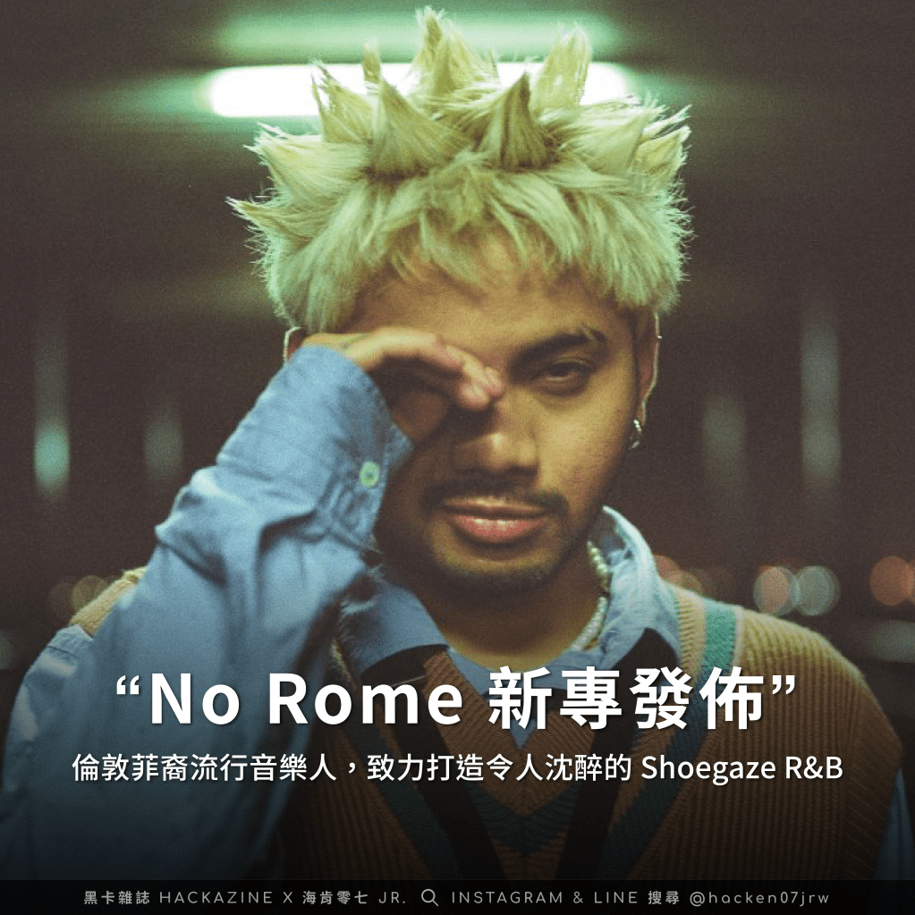 No Rome 聽著 Joy Division、New Order、Box Car Racer、Bjork、Slipknot、My Bloody Valentine 等各種音樂流派長大,在懵懵懂懂摸了幾年音樂並在馬尼拉研讀音樂學院後,經過各種機緣巧合終被 The 1975 的廠牌 Dirty Hit 挖掘,正式開始這段奇幻旅程;其先後發行的多張 EP 獲得佳績也是很酷的證明,絕非偶然碰撞出的零星火花。