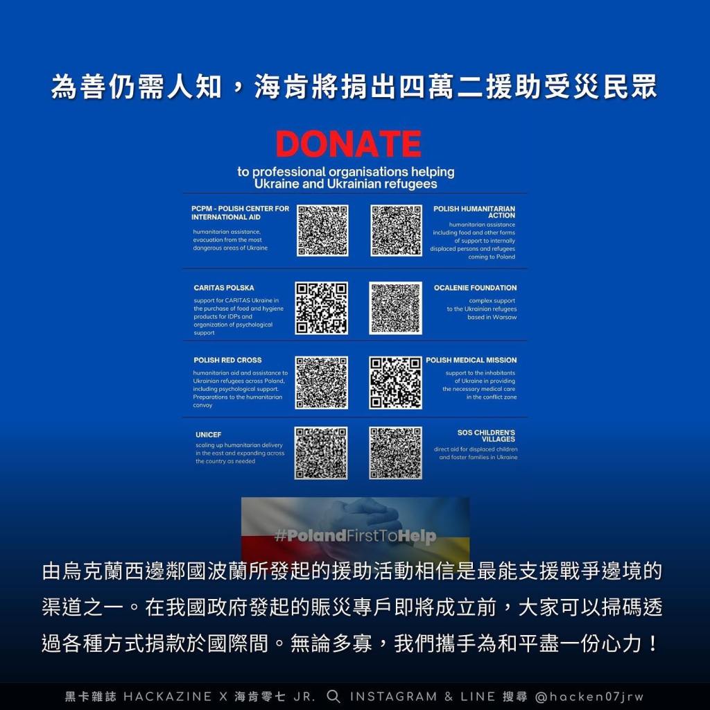 由烏克蘭西邊鄰國波蘭所發起的援助活動相信是最能支援戰爭邊境的渠道之一;在我國政府發起的賑災專戶即將成立前,大家可以掃碼透過各種方式捐款於國際間。無論多寡,我們攜手為和平盡一份心力!
