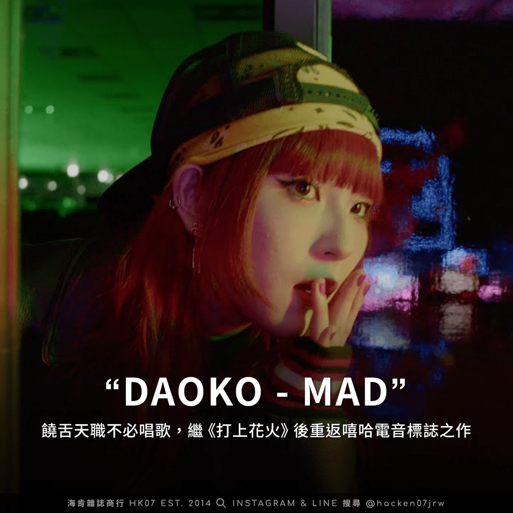 近年以一曲〈打上花火〉打響國際名號、成為家喻戶曉存在的 DAOKO 再推新作 EP《MAD》,攜手 DJ 製作 Yohji Igarashi ,決定放下往日榮辱,重操少女前期聞名的電音饒舌元素,以洗鍊沉穩的酷玩態度宣布回歸!