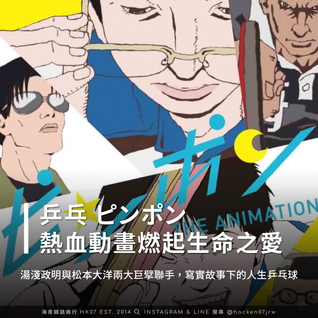 《乒乓》改編自漫畫大師松本大洋 1996 年同名作品,由動畫鬼才 湯淺政明 負責擔任監督,全篇僅短短11集,卻有著極為強烈的情感刻畫,上至主角下至跑龍套的小人物皆有其獨特風味,有別於多數運動題材作品講究運動家精神,《乒乓》所探討的層面更為深遠,從個人創傷、理想與現實、天才與庸才,回到生命本質的自由與熱愛;一句概括就如同故事裡 孔文革 說的:「我不是在談乒乓球,我是指人生。」