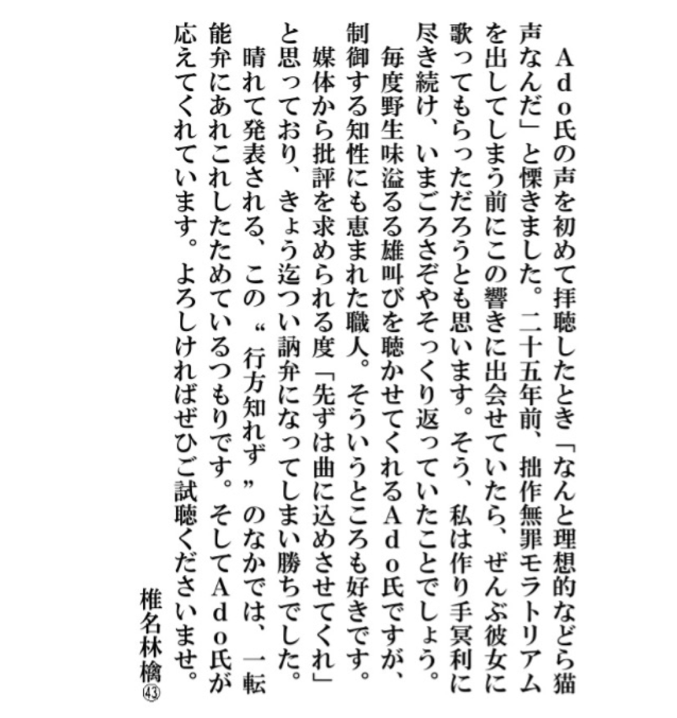椎名林檎也以「第一次聽見時我忍不住全身發抖。」來讚嘆 Ado 兼具野性及知性的獨特唱腔。「如果早在 25 年前就與 Ado 相遇,我想我會把〈無罪モラトリアム〉讓給她唱。」此次合作可說是滿足了新舊世代歌迷的期待,相信對兩位不同世代的頂尖歌姬來說,也是一次重要的體驗與靈感衝撞。