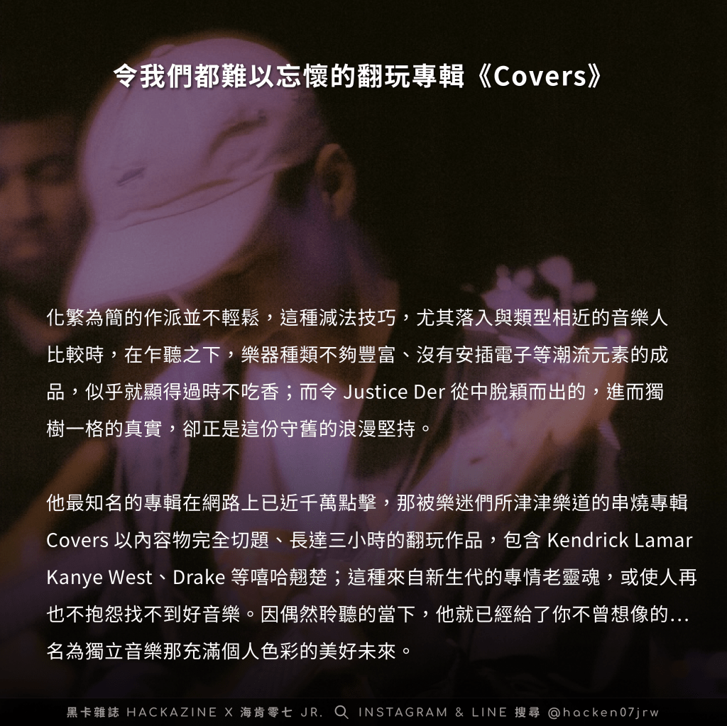 像是cover同鄉的當代商業嘻哈天王 Drake,其名曲的 Passionfruit,Justice 就完全打碎原先律動、流行的音樂包裝,而以一襲更加沉澱、低調的氣質覆身,使翻玩之作掙脫本格曲風的力道,奏生出一番絲滑異趣,可見其細膩心思。不過⋯若他觸及音樂元素相差甚遠的歌曲呢?