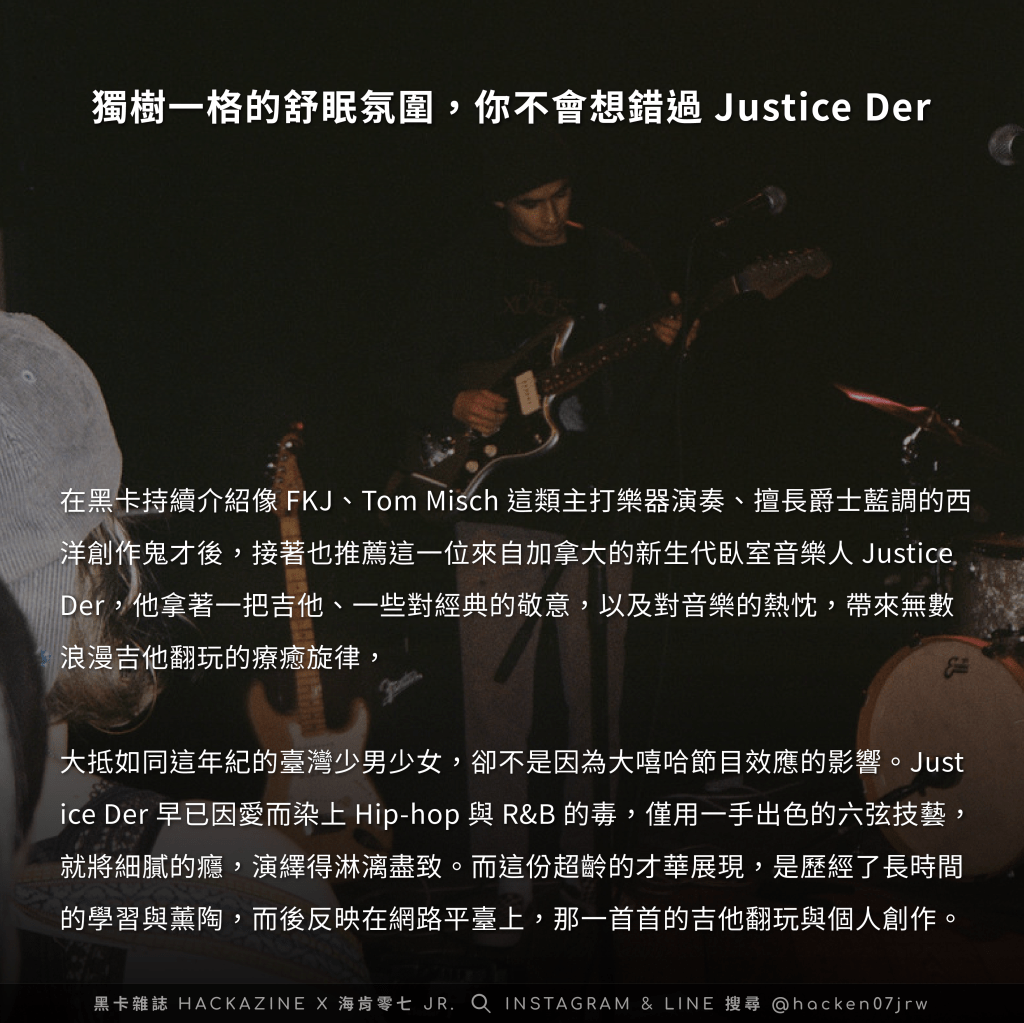 在我們持續介紹像是 FKJ、Tom Misch 這類主打樂器演奏、擅長爵士藍調的西洋創作鬼才後,接著也推薦這位來自加拿大的新生代臥室音樂人 Justice Der,他拿著一把吉他、一些對經典的敬意,帶來無數翻玩的療癒旋律。