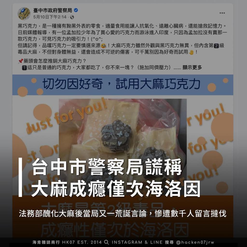法務部醜化大麻後當局又一荒誕言論:台中市警察局謊稱大麻成癮性僅次海洛因,慘遭數千人留言撻伐